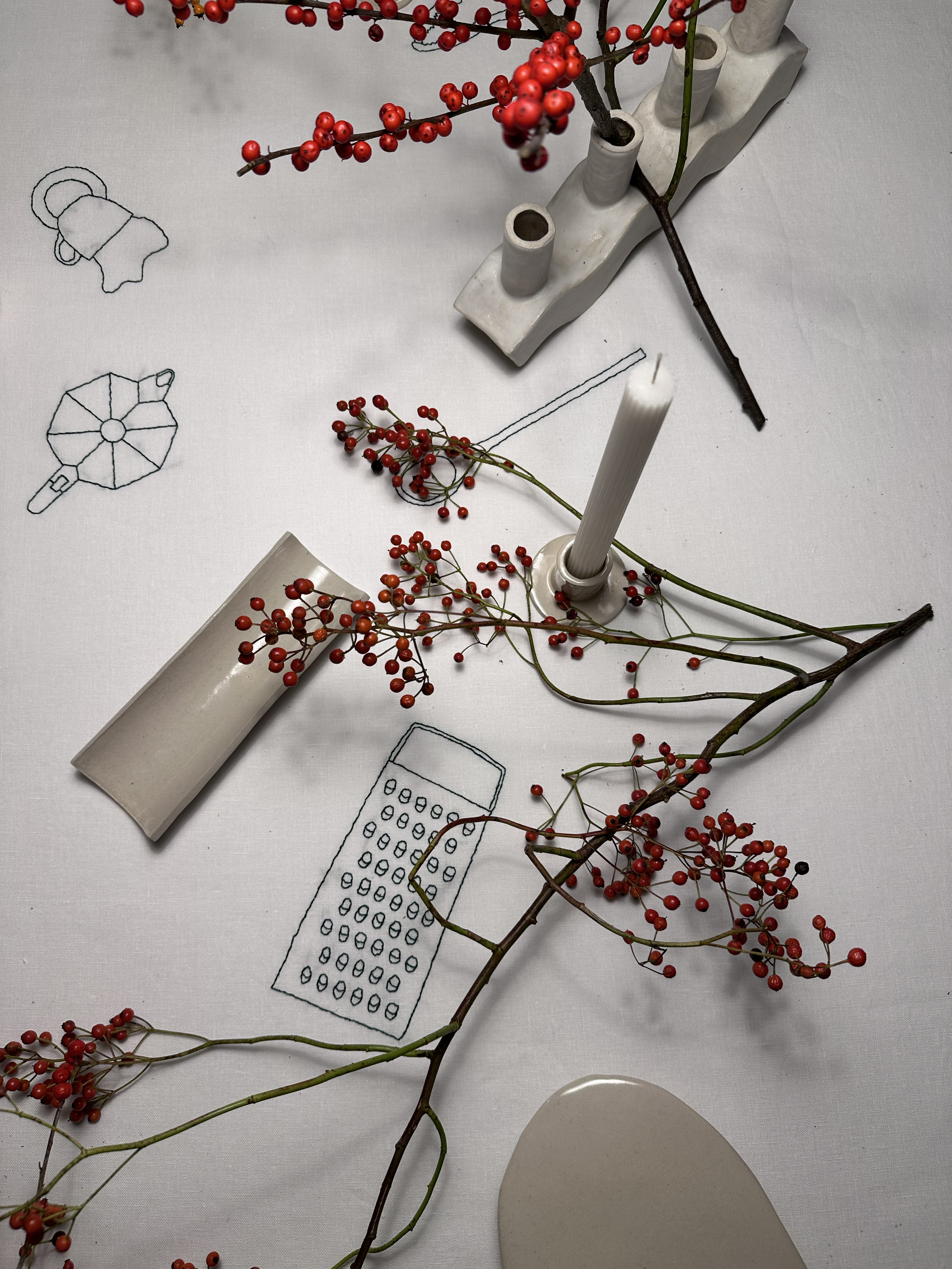 Ceramics and handmade embroidered tablecloth.